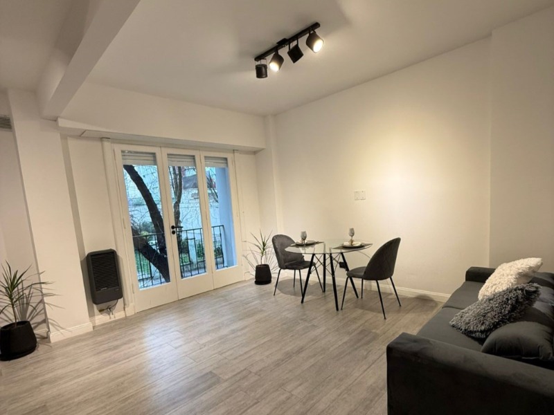 Departamento de 2 ambientes al contrafrente. Cuenta con living comedor equipado con mesa y sillas, calefactor con tiro balanceado. Cocina separada con barra. revestimientos en porcelanato. Cocina equipada con heladera, cocina, calefon a estrenar. baño de servicio. baño completo con ducha, mampara,Pasillo con placard, Dormitorio con sommier de dos plazas. respaldo y ventanal al exterior. Totalmente reciclado a nuevo, cortinas, iluminacion a estrenar. Se entrega amoblado tal cual esta en las fotos.