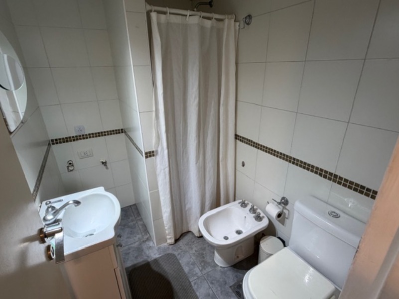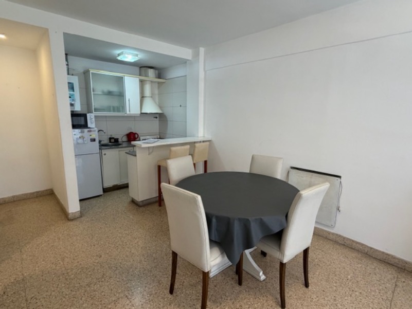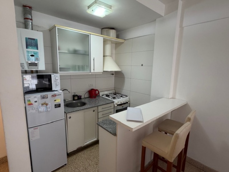 Baño completo. Cocina integrada al living con barra desayunadora.