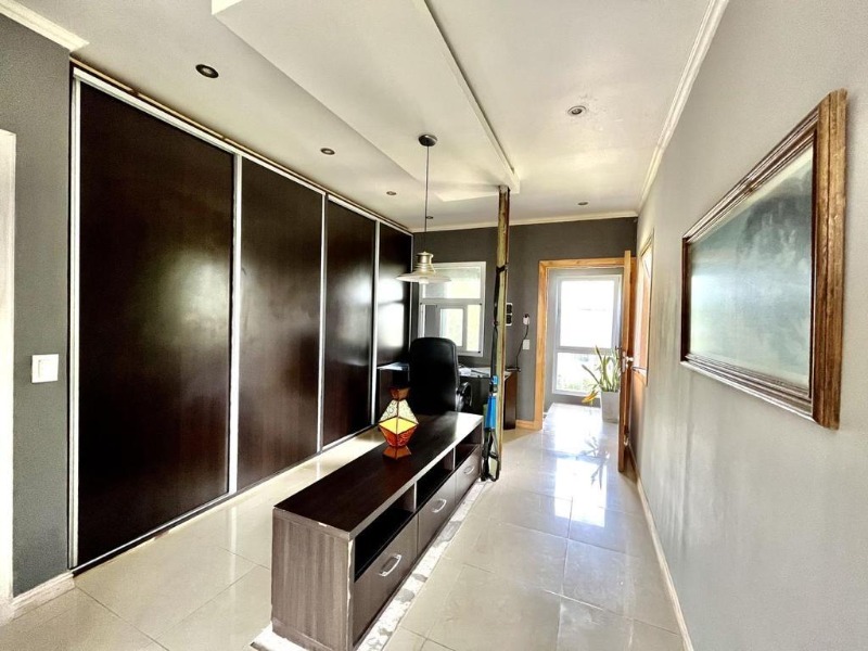 planta alta. Planta Alta: con ventanal de 2M de largo y 2 M de ancho al lado hay otro ventanal de 1,90 x 90Cm en el segundo ventanal se encuentra una puerta de madera con salida a la sala de estudio que tiene una ventana que da a la escalera y un placard pegado a la pared (tiene la misma medida) desde ahí a continuación tenes el gimnasio luminoso con ventanales Grandes que da a una habitación que se separa con pared de durlo, la habitación tiene un ventanal de 2x2 salimos por la puerta al frente tiene otra puerta que lleva al 2do hool que distribuye a las 3 habitaciones, vestidor y baño una de las habitaciones tiene balcón y el baño cuenta con bañera. Jardín: cercado con pinos, adentro de los mismos árboles frutales (durazno, níspero). Y de noche Luz solar en el jardín .