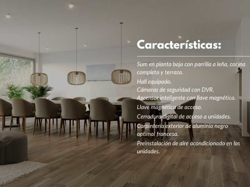 Departamentos de dos y tres ambientes a la calle con cochera y baulera, ubicados en el edificio Ankara I. Se desarrolla en 7 pisos con SUM en planta baja con parrilla a leña, cocina completa y terraza. Todas las unidades cuentan con balcón al frente, cocina incorporada al living-comedor, un toilette de recepción, un dormitorio en suite en los departamentos de dos ambientes y dos dormitorios en suite en los de tres ambientes.