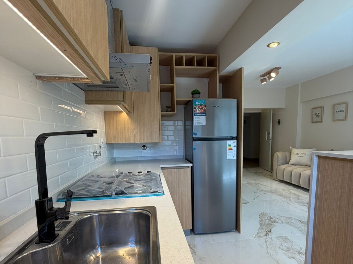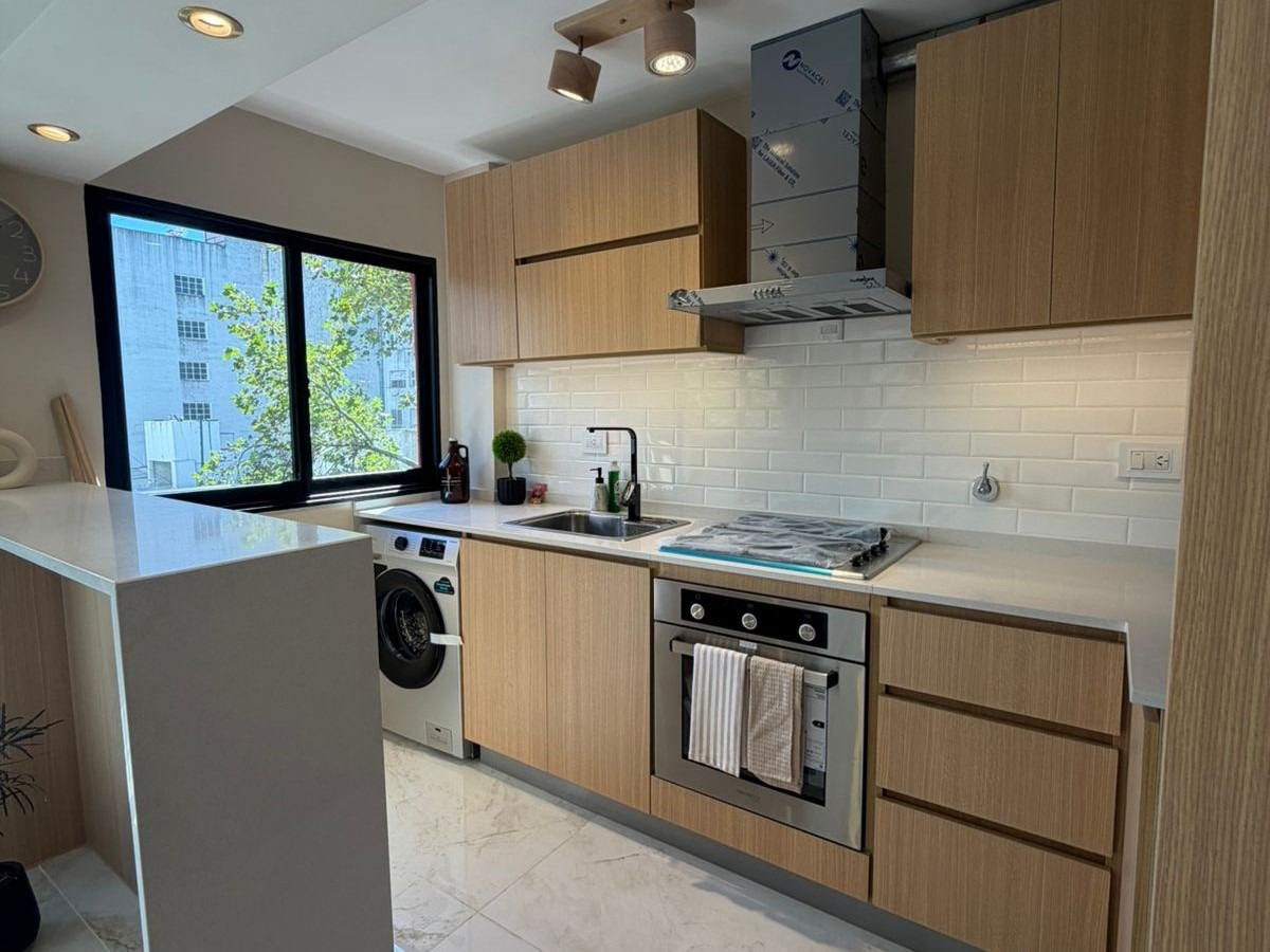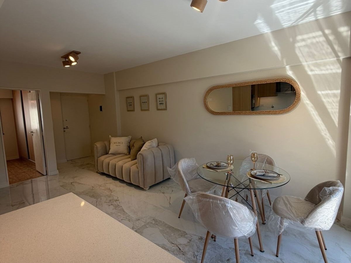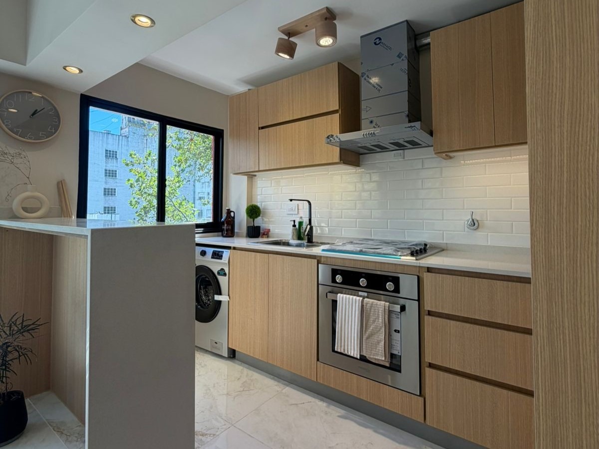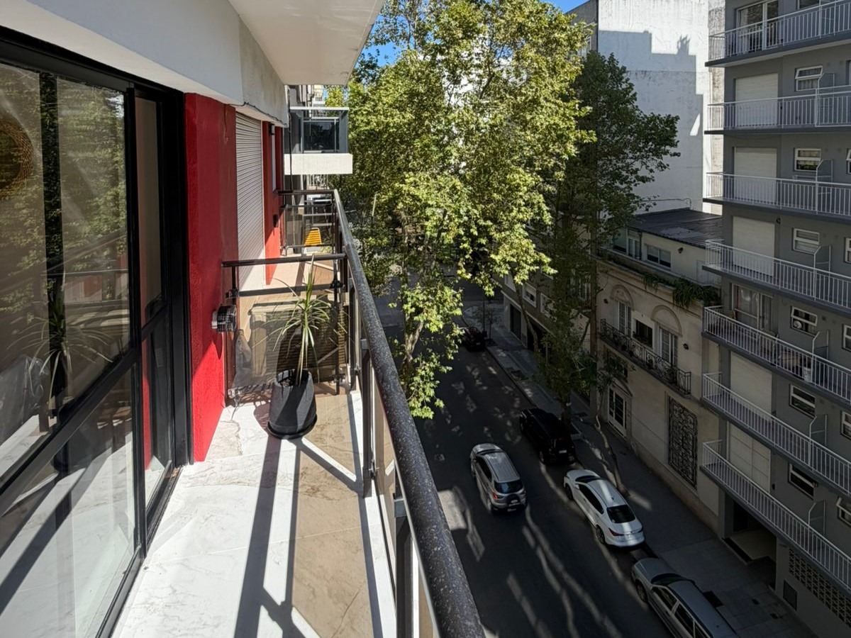Departamento de dos ambientes totalmente reciclado, ubicado en un quinto piso a la calle. Al ingresar encontramos un amplio living-comedor, cocina integrada con barra desayunadora, lavarropas y balcón saliente. Por pasillo de distribución se encuentra un baño completo con ducha y un dormitorio con placard empotrado al contra frente.